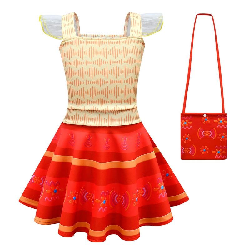 Palavras-chave: fantasia Dolores Madrigal, vestido Encanto, conjunto de fantasia infantil, roupa temática para meninas, fantasia de verão, vestido de festa infantil.