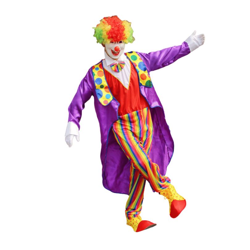 Fantasia Palhaço Cosplay Adulto Roxo com Calça Arco-íris