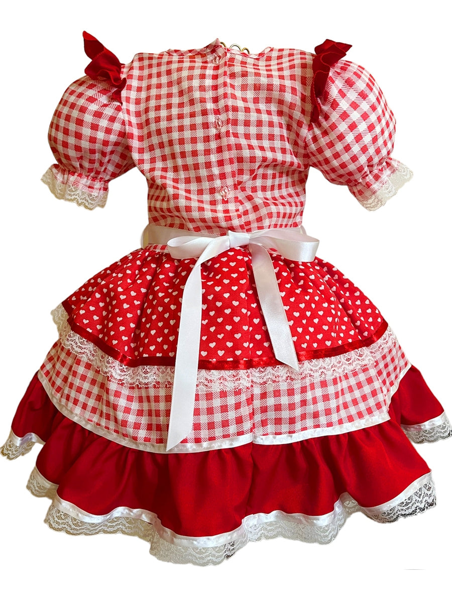 Apresentamos a Fantasia Vestido São João Festa Junina Caipira Infantil, uma peça encantadora em xadrez vermelho e branco, perfeita para as celebrações de São João. Este vestido luxuoso com detalhes únicos é ideal para meninas que querem brilhar nas festas e nas quadrilhas.