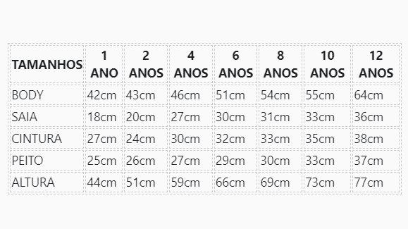 TAMANHOS | 1 ANO | 2 ANOS | 4 ANOS | 6 ANOS | 8 ANOS | 10 ANOS | 12 ANOS |